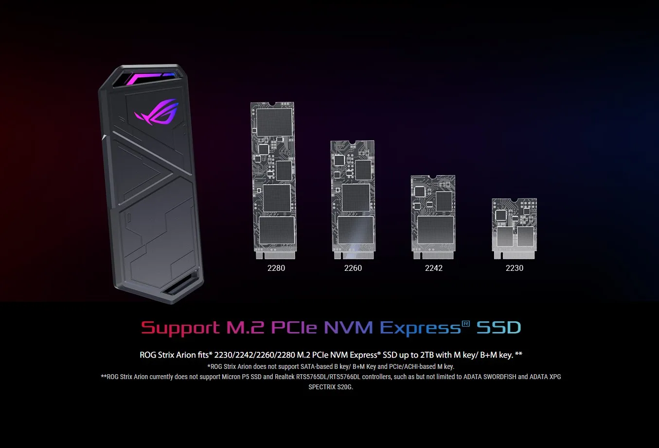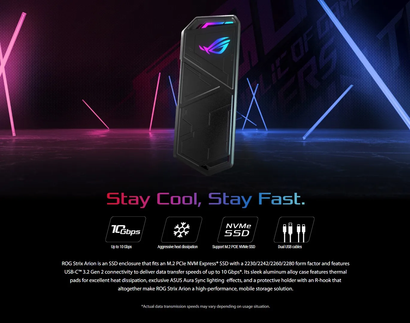 ASUS ROG STRIX ARION M.2 NVMe Gehäuse ermöglicht Ihnen ultraschnelle Datentransfers und unterstützt M.2 NVMe Formate von 2230 bis 2280. Mit einer Übertragungsgeschwindigkeit von bis zu 10 Gbps über USB 3.2 Gen 2 ist dies die perfekte Lösung für Ihre Speicherbedürfnisse.
